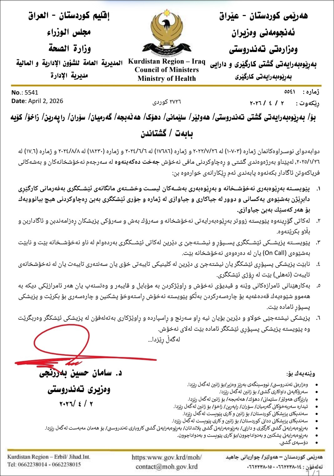 گشتاندنەكە تایبەتە بە ڕێكخستنەوەی دەوامی ئێشكگری سەرجەم نەخۆشخانە و ناوەندە تەندروستیەكان و قەدەغەكردنی ئامرازەكانی وێنە و ڤیدۆی نەخۆش و قەدەغەكردنی بەكارهێنانی مۆبایل و ڤایبەر و وەتسئەپ و هەر ئامرازێكی دیكە بۆ ڕاوێژكردن و چارەسەركردنی نەخۆش.